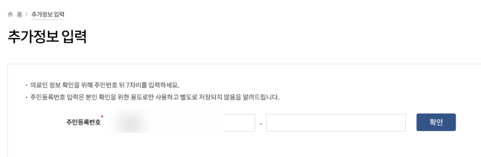 인증절차가 끝나면 추가 정보를 입력해야 합니다.의료인임을 확인하기 위해 주민번호를 입력해야 합니다.