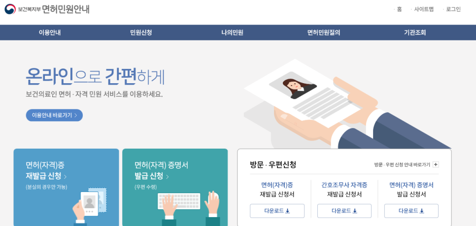 민원 → 보건의료인 면허(자격)민원을 클릭해주세요.