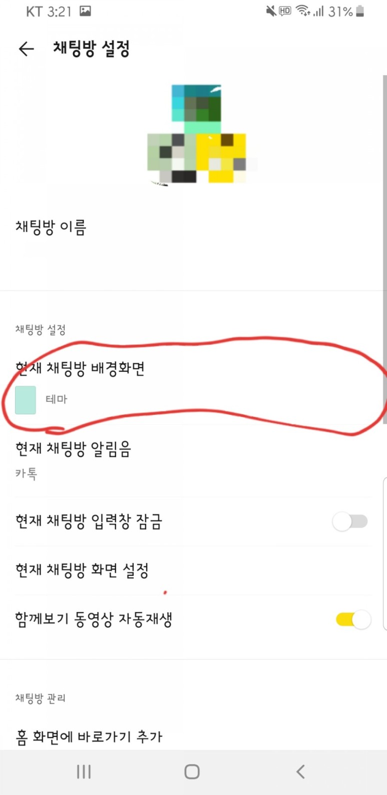 대화방 설정에 오셨다면 현재 대화방 배경화면이라고 적혀있는 버튼을 눌러주세요.