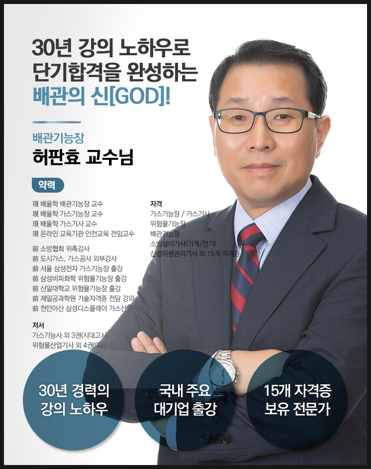 누가 강의를 하느냐에 따라 합격 여부도 달라져요.배관기능장 필기시험 인강은 30년 강의 노하우로 단기 합격을 완성한 배관의 신 허판효 교수의 강의가 기다리고 있습니다.