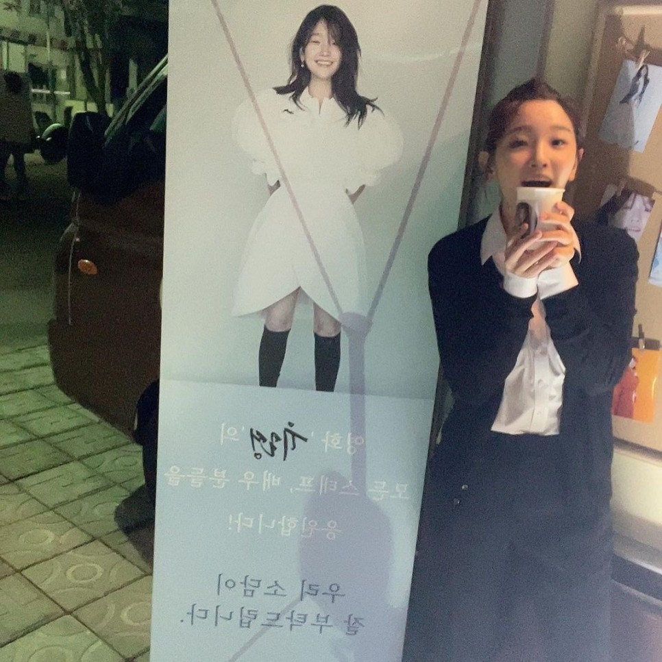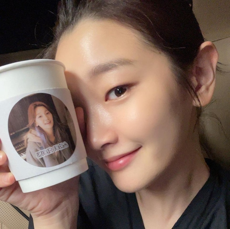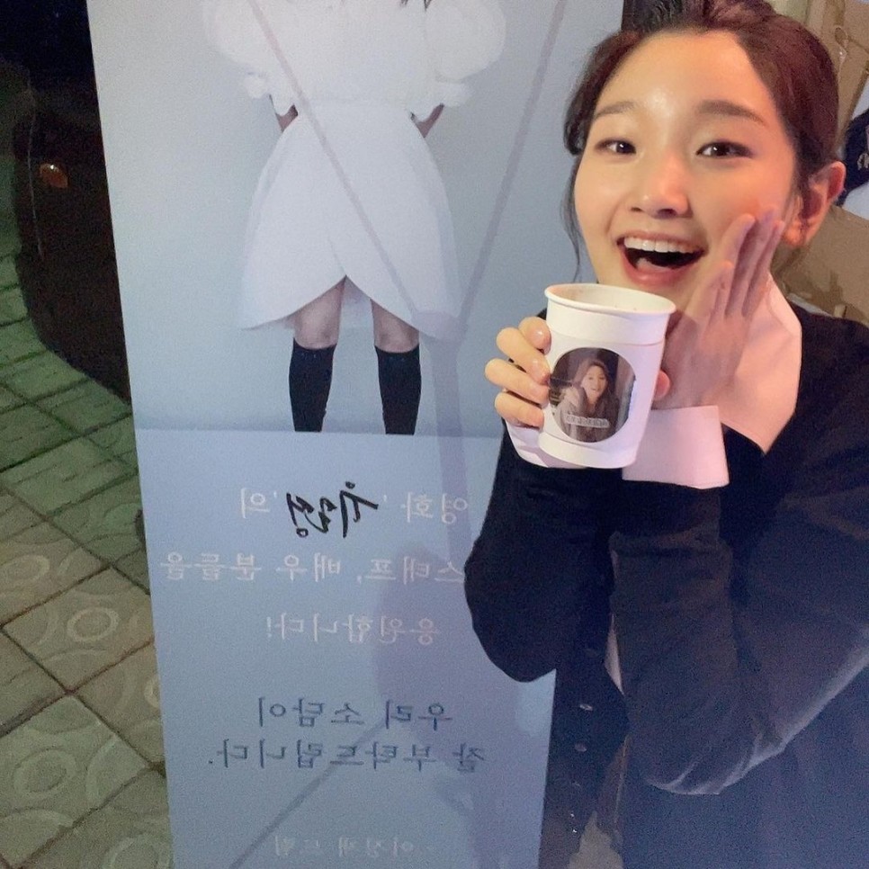 배우 박소담이 선배이자 소속사 이사 이정재에게 받은 커피차에 행복한 미소를 지었다.