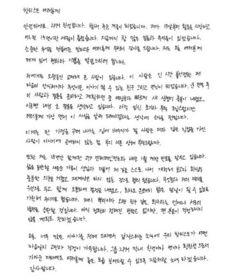 황찬성은 “갑작스러운 소식에 우리 2pm 팬클럽(핫티스트)이 어떤 마음일지 고민과 걱정으로 가득하다”며 “2PM의 막내 찬성이자 연기자 황찬성으로서 가까운 미래에도 여러분에게 좋은 모습을 보여드릴 수 있도록 지금처럼 노력하겠습니다”라고 말했다.