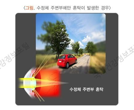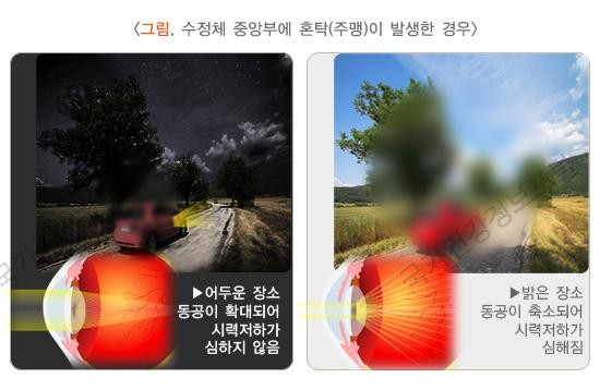 백내장 증상으로 가장 대표적인 것이 희미하게 보이는 증상인데, 안경을 쓴 채로도 시력을 교정할 수 없다는 것입니다. 수정체 주변부만 탁한 경우는 백내장의 초기 증상으로 시력 저하를 별로 느끼지 못하는 경우가 있다고 합니다.