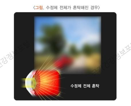 백내장은 눈 안에 있는 맑고 투명한 수정체가 어떠한 이유로 흐릿하게 흐려지고, 바깥으로부터 눈이 들어오는 빛이 투과하지 않고 산란하여, 사물이 점점 희미해져 가는 질환입니다.