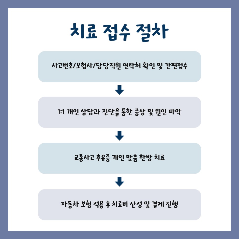 환자들의 개인면담을 통해 보험접수와 합의요령 등 복잡하게 느껴지는 사고 이후의 절차에 대해 한방병원에서 항상 적극적인 도움을 드리고 있으니 주저하지 마시고 꼭 방문해 주시기 바랍니다.치료에만 전념하실 수 있도록 항상 한방병원을 안내드리겠습니다!