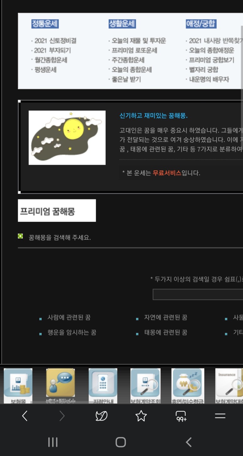 마지막으로 공짜 운세가 아니라 조금 다르게 생긴 꿈 풀이입니다. 아래는여러대분류가있는데본인이직접알고싶은단어또는문장을직접써서살펴볼수도있습니다. 태몽까지 7가지로 나누어져 있나 봐요. 이렇게 신한생명 무료점을 비롯한 것들에 대해 확인해 보았습니다.
