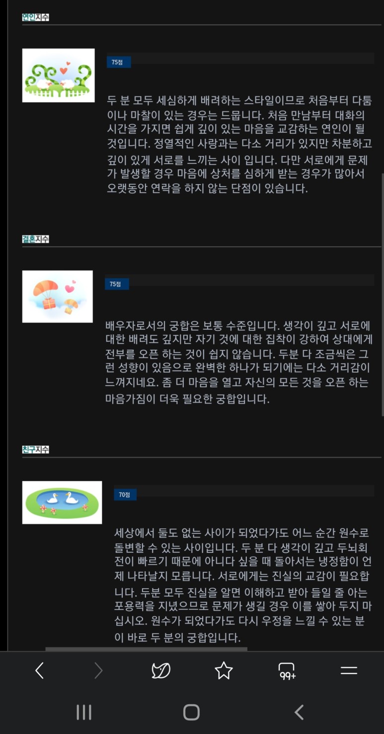 또 앞서 든 궁합 중 내용을 보면 다음과 같습니다. 이때본인을비롯해서상대방에대한사항도쓰면되는것입니다. 그리고 그 사람이 본인의 애인이거나 친구일 때부터 시작해서 결혼할 경우 어떻게 되는지 일정 점수와 함께 글이 나와 있습니다.