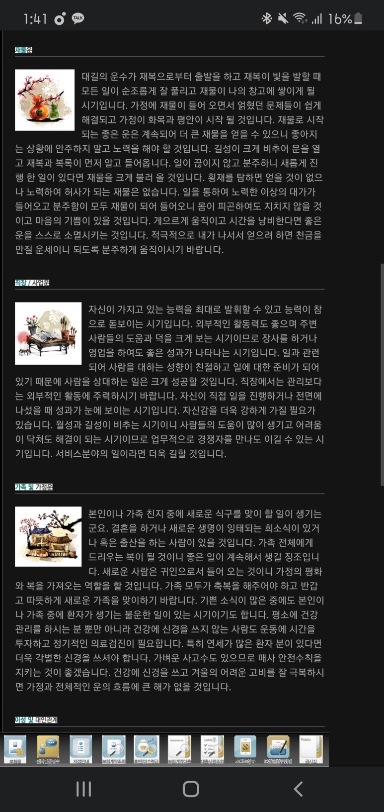 먼저 위쪽에 보면 자기가 쓴 글을 바탕으로 해서 1차적인 글씨가 보입니다. 그것을 바탕으로 대운이라고 하는 것이 어느 지점에서 생기는지를 설명합니다. 그리고 아래쪽에는 세부적인 토정비결이 나타나는데 기본적으로는 일년을 기준으로 총운을 나타내고 있습니다.