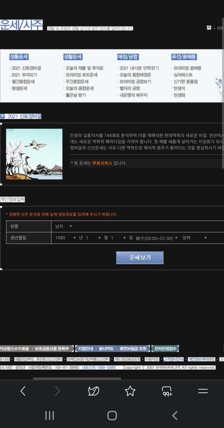 보시다시피 윗부분에는 재물이나 애정운 등을 볼 수 있는 것부터 시작하여 탄생석과 꽃 등에 대한 것들이 나뉘어져 있습니다. 우리가 보고 싶은 무료 운세 같은 것은 왼쪽 맨 위에 표기되어 있습니다. 이후에는 신한생명토정비결을 보기 위해 사주팔자를 쓰게 되어 있습니다.