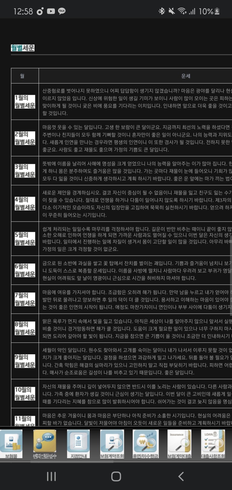 또 무료 운세를 통해 월별의 내용을 볼 수 있습니다. 내년 1월부터 12월까지 어떻게 지내는 게 좋은지 설명할게요. 3~4줄 정도 적당한 길이로 쓰여져 있음을 알 수 있습니다. 다음으로 신한생명에는 무료점 이외에도 다른 것을 볼 수 있습니다.