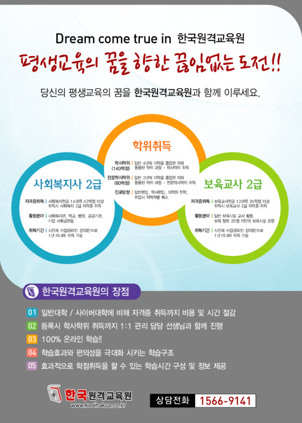 저 같은 경우 메가원격평생교육원에서 일부 학습지원을 해주셔서 등록하게 되었는데 학점은행제가 처음이라 어떻게 해야 할지 당황스러웠지만 정말 친절하게 전화해주시고 과정과 방법을 자세히 알려주셨습니다.교육과정은 중간에 카톡으로 계속 연락이 오기 때문에 강의를 놓치지 않고 제때 수강할 수 있는 점도 편했습니다.