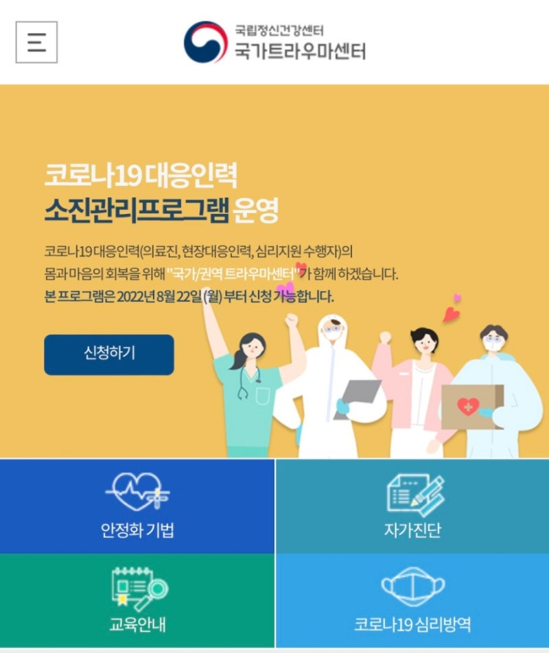 <이미지 : 국가트라우마센터 홈페이지 화면>무엇이 내 마음을 괴롭히고 있는지 알아보기 위해 국가트라우마센터 홈페이지(https://www.nct.go.kr/)에서 ‘외상 후 스트레스 증상 질문지’로 자가진단을 해보고, 심프로그램 앱(App)을 통해서도 ‘심건강평가’ 등을 받을 수 있습니다.<이미지 : 마음 프로그램 앱(App) 화면>단, 이번 사고 이후 심리적 어려움이 지속될 경우 정신건강의학과 전문의와 상담하여 전문적인 치료를 받는 것을 권장합니다.최근 이태원 사고 당시 현장 영상과 사진이 소셜네트워크서비스(SNS), 온라인 등을 통해 유포·확산되고 있습니다.다수의 사람에게 심리적 트라우마를 유발할 수 있는 만큼 추가 유포와 확산 그리고 일상생활에 영향을 미칠 정도의 과도한 시청을 자제해 주시기 바랍니다.단, 이번 사고 이후 심리적 어려움이 지속될 경우 정신건강의학과 전문의와 상담하여 전문적인 치료를 받는 것을 권장합니다.최근 이태원 사고 당시 현장 영상과 사진이 소셜네트워크서비스(SNS), 온라인 등을 통해 유포·확산되고 있습니다.다수의 사람에게 심리적 트라우마를 유발할 수 있는 만큼 추가 유포와 확산 그리고 일상생활에 영향을 미칠 정도의 과도한 시청을 자제해 주시기 바랍니다.