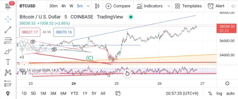 보통 5분봉이나 15분봉을 보고 고배마진을 하기 때문에 긴 머리를 쓰기 애매하다. 조금 더 오르면, 쇼트를 잡으려고 하거나 벌써 쇼트를 가지고 내리는 것을 기다리는 트레이더가 많을 것이다.