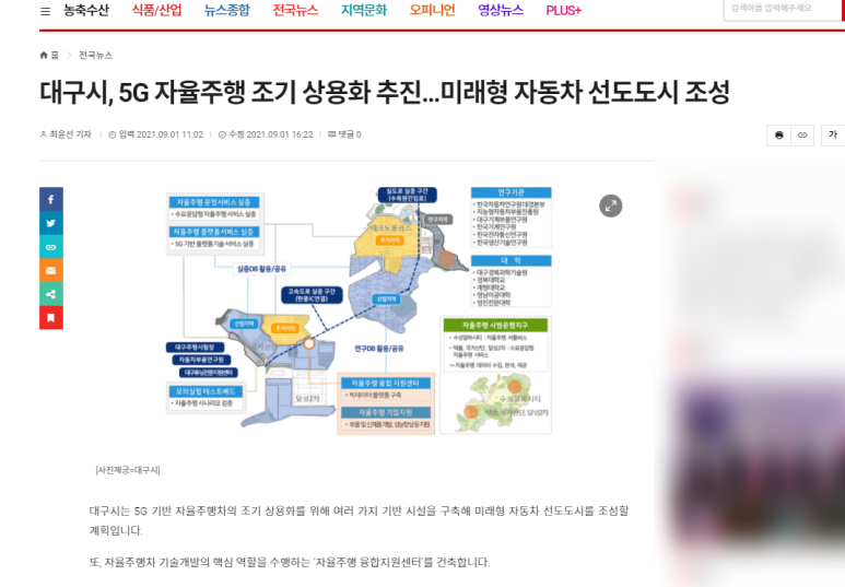 사실 일자리가 없다고 하는 위약층들이 밟기 어려운 도시가 대구라고 생각했는데 미래 신성장산업의 주축인 자율주행자동차가 대구에서 개발된다고 하니 좋은 소식입니다.//뉴스 기사입니다.//http://www.newskr.kr/news/articleView.html?idxno=70629 대구시는 5G기반 자율주행차의 조기 상용화를 위해 다양한 기반시설을 구축하여 미래형 자동차 선도도시를 조성할 계획입니다. 또한 자율주행차 기술개발의 핵심적인 역할을 할 것입니다.