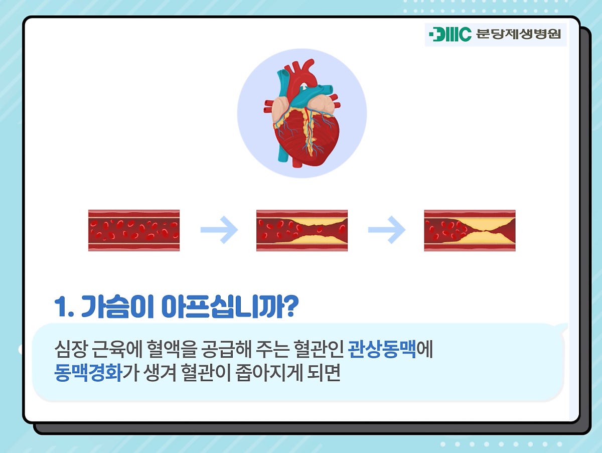 흉통이 있는데 심장질환일까봐 무서워요.▶ 흉통이 모든 경우 심혈관계 질환의 원인은 아닙니다.