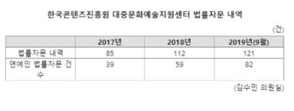 9일 국회 문화체육관광위원회 소속 바른미래당 김수민 의원이 한국콘텐츠진흥원 대중문화예술지원센터에서 제출받은 최근 3년간 법률자문 내역에 따르면 2017년 85건에서 2018년 112건으로 늘었고 지난해에는 9월 기준 121건에 이르렀다.