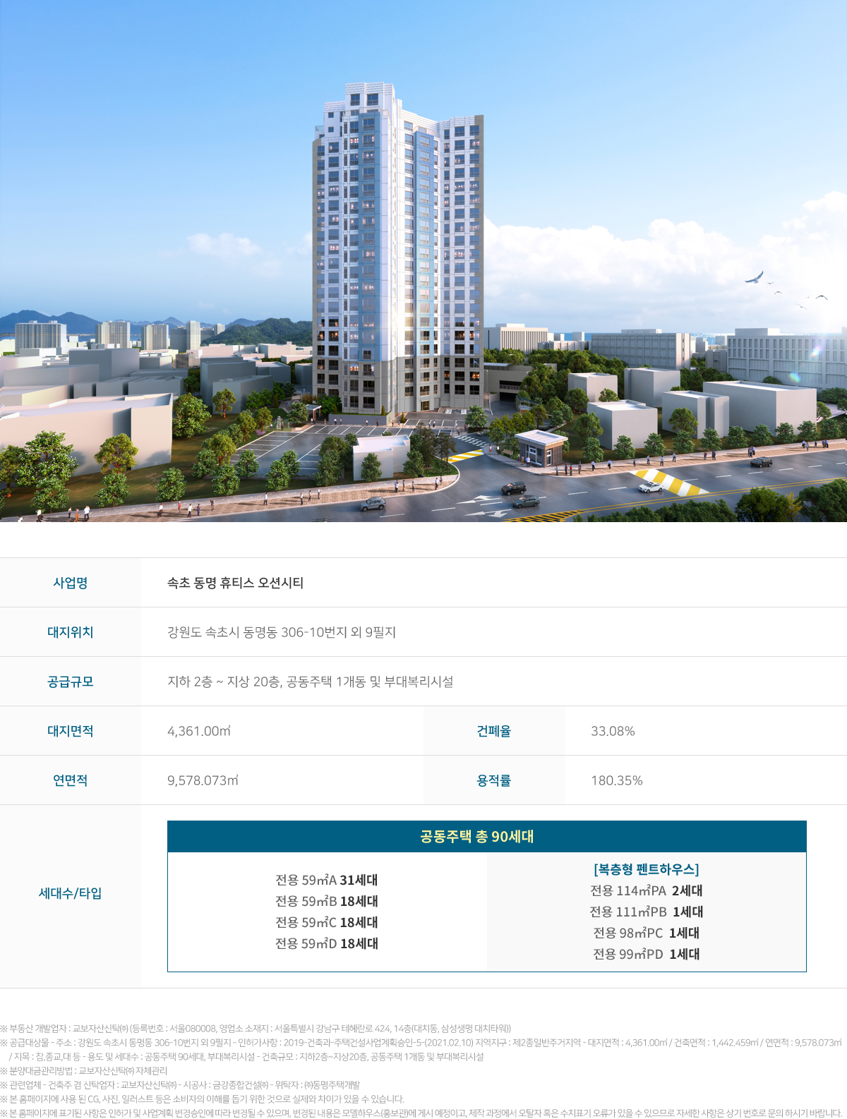 이번 교보자산신탁㈜이 공급 예정인 강원 속초시 동명동에 공급하는 #속초동 명휴티스 오션시티가 선착순 분양을 시작해 주목받고 있습니다.속초시 동명동 일대에 들어서는 이 단지는 지하 2층~지상 20층으로 전용면적 59㎡ 85가구, 펜트하우스 5가구로 총 90가구가 공급된다.