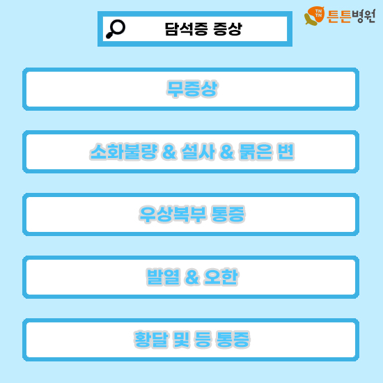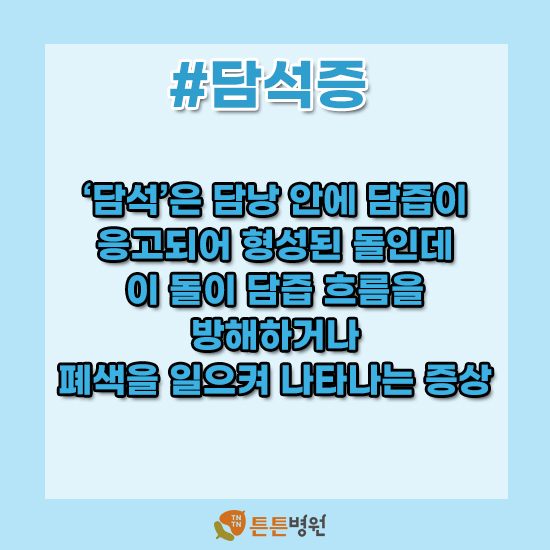 담석이라 함은 담낭 안에 담즙이 응고하여 형성된 석을 말합니다.이 석회가 담즙의 흐름을 방해하거나 폐색을 일으켜서 나타나는 증상입니다.