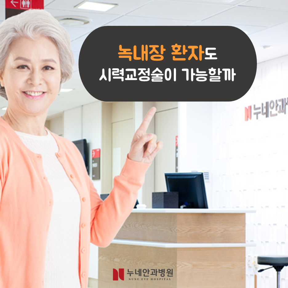 녹내장 환자도 시력교정수술로 더 밝은 세상을 볼 수 있습니다 다만 중기 이후의 녹내장은 시력 교정 수술을 피하는 것이 안전합니다. 또한 염증으로 인한 2차성 녹내장, 외상성 녹내장, 특수 녹내장 환자나 녹내장 수술을 받은 경우에는 안경 등 시력교정술 이외의 대안을 모색하는 것이 바람직합니다.