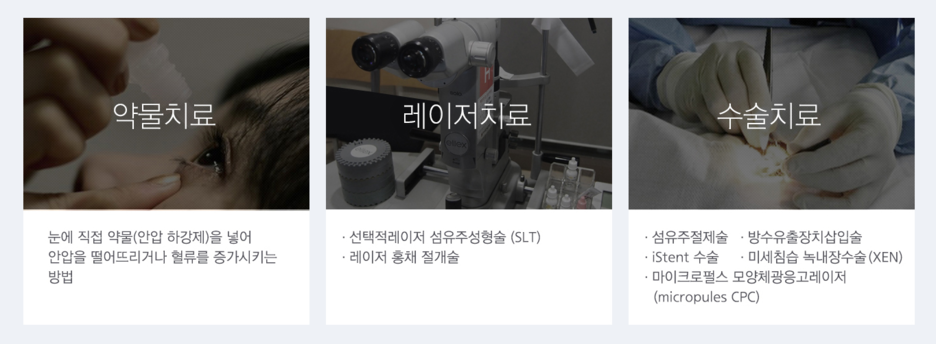 녹내장은 증상과 개인의 상태에 따라 적절한 치료법을 선택할 필요가 있습니다. 치료 목표는 발병 전 상태의 회복이 아니라 현재 상태에서 더 이상 시신경이 손상되지 않도록 안압을 유지하는 데 있습니다. 방법은 약물, 레이저치료, 수술 등으로 분류됩니다.