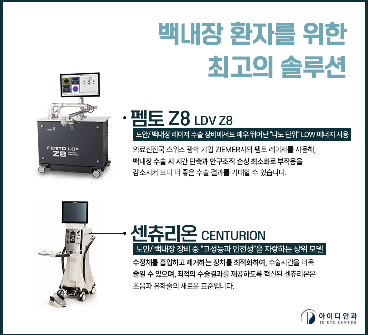 주로 수정체 유화술(초음파), 레이저 백내장 수술 방법으로 교정이 이루어집니다.ZIMMER사의 펨토 LDV Z8과 센츄리온(수정체 유화술)을 활용하고 있습니다.펨토 LDV Z8의 경우 진행시간이 단축되고 안구조직을 최소화할 수 있다는 점에서 가장 많이 사용되는 장비입니다.센츄리온의 경우 안압 변화를 실시간으로 확인하여 탁한 부위의 수정체를 적절한 방법으로 제거할 수 있습니다.안압의 변화도가 높은 분들에게 제안되는 장비로 현재 가장 안전성이 우수하여 평판이 좋습니다.