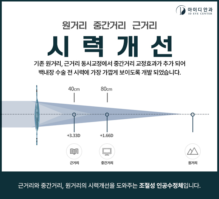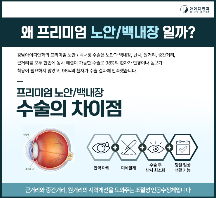 여기서는 환자의 눈요기 길이를 고려하여 7가지 프리미엄 인공수정체를 제안합니다.수술은 마취는 안약 점안으로 이루어지며 최소한의 범위만 절개하여 회복이 빠르다는 장점이 있습니다.노안과 백내장을 동시에 교정할 수 있고, 난시 등의 사후 후유증의 위험이 낮습니다.