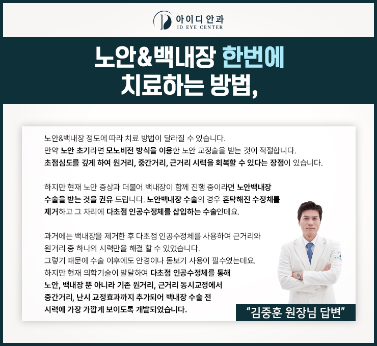 많은 분들이 노안 백내장 수술에 부담을 느끼는 이유는 바로 회복 기간, 수술 시간입니다.과거에는 노안 백내장 수술을 한꺼번에 진행할 수 없었기 때문에 절개범위가 넓고 회복기간이 길어 후유증이 오는 경우가 많았기 때문입니다.”현재 두 질환을 동시에 교정할 수 있고 절개범위가 적어 회복기간이 짧고 후유증에 대한 위험도도 낮아졌다.