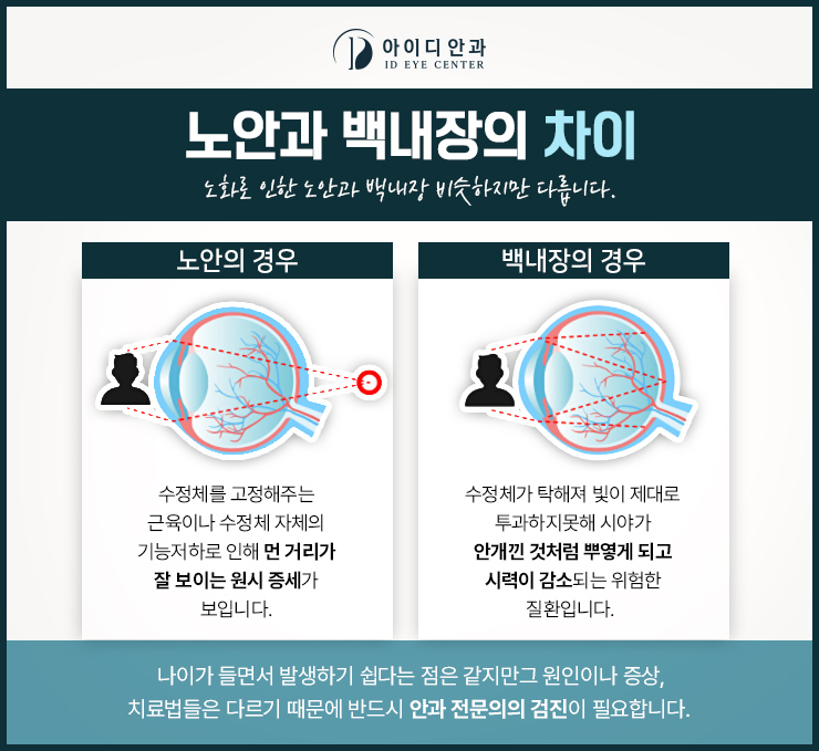 그러나 백내장은 녹내장으로 이어지면 시력을 잃을 수 있는 만큼 적절한 관리방법을 알아봐야 합니다.노안과 백내장은 한꺼번에 교정할 수 있고, 후유증이 없도록 사후관리가 철저한 의료기관을 방문하는 것이 좋습니다.또한 경험이 풍부한 전문의와 직접 상담하는 것이 좋습니다.