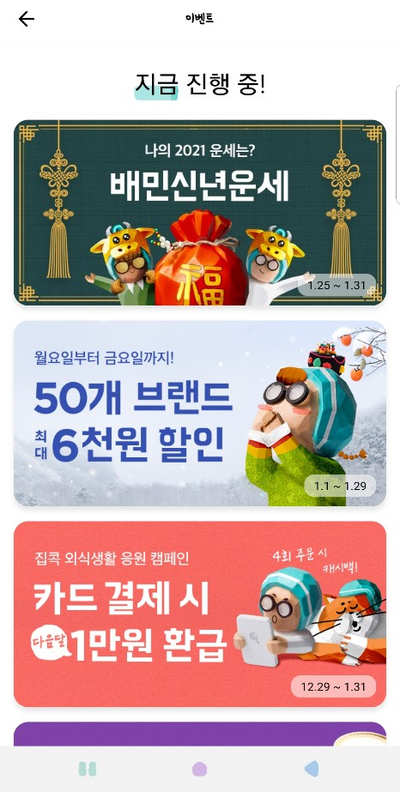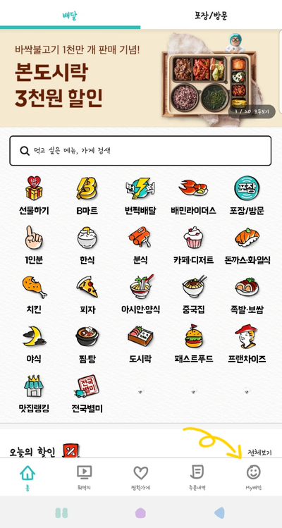 먼저 배달의민족 앱을 열어보세요!그 다음 하단 오른쪽에 있는 My 배민을 눌러주시면 맨 위에 배민이의 새해 운세가 있습니다.여기로 들어오세요!