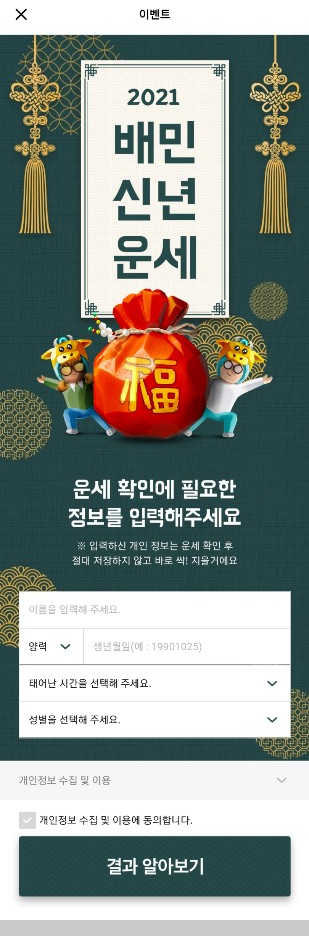 간단히 이름, 생년월일, 태어난 시간, 성별을 선택하고 개인정보 수집 및 이용에 동의합니다를 선택한 후 결과 확인을 누르면 바로 종료!