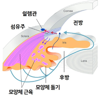방수의 생산과 배출 각막은 앞쪽과 뒤쪽에 방수라는 체액으로 채워져 있어 일정한 탄력으로 형태를 유지하고 있습니다. 이 방수는 모양체에서 생산되며 90% 정도는 섬유주를 통해 슐렘관을 통과합니다. 안압은 방수 수압이라고 할 수 있으며, 정상 안압은 11에서 21mmHg의 범위에 있습니다.