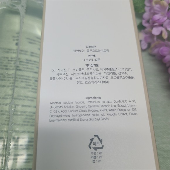 부담이 적은 걸 찾아다녔던 저에게 이 제품은 정말 안성맞춤이었어요안에 들어 있는 것은 입안을 청결하게 유지하고 충치를 예방하며 구취를 제거해 주는 기능을 한다고 합니다.알란토인은 잇몸건강에도 도움이 되므로 잇몸이 약한 사람에게도 사용하십시오.