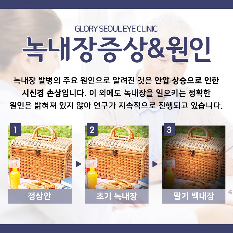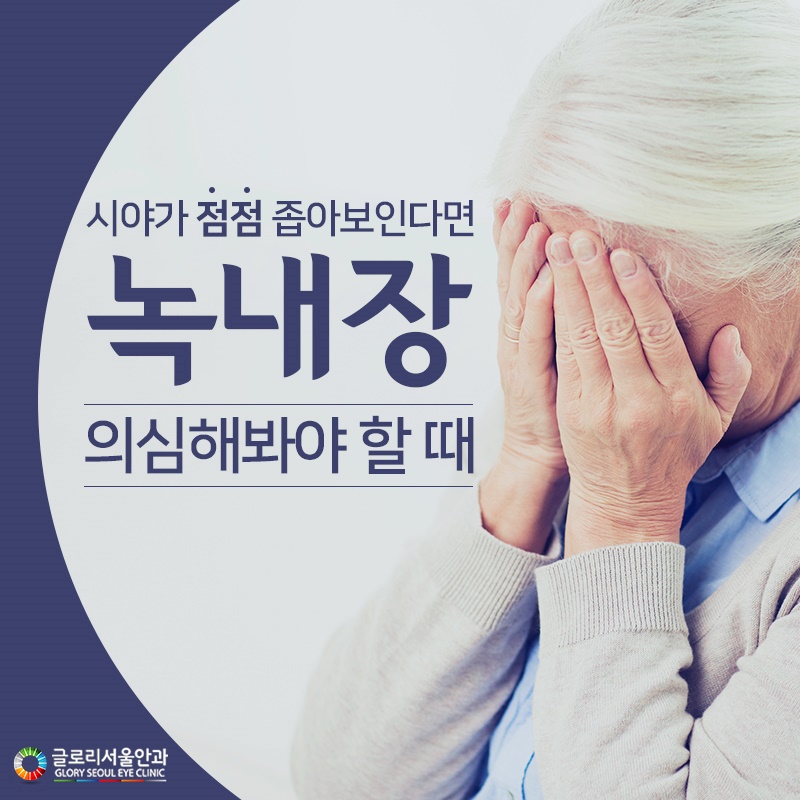 100세 시대로 접어든 요즘 저희는 좀 더 각별한 건강 관리가 필요해요 많은 사람들이 신체 건강에 대한 관심도는 높은 반면 눈 건강에 대한 관심도는 상당히 낮은 편이라고 할 수 있습니다. 눈은 우리가 살아가는 데 없어서는 안 될 절대적인 신체 기관으로 많은 기능을 수행하고 있습니다.이런눈건강,제때안지키면정상적인삶을살기어려울수밖에없습니다. 따라서 눈의 노화가 시작되는 40대부터는 매년 신체건강검진을 받듯이 눈의 정밀검진도 받는 것이 좋습니다. 나이가 들면 백내장에서 녹내장, 황반변성 등의 노인성 안질환을 앓을 확률이 높아지므로 더욱 주의 깊은 관찰과 관리가 필요합니다.오늘은 소리 없는 시력 도둑이라고 불리는 녹내장에 대해 공부를 하고 싶습니다. 녹내장의 원인부터 녹내장 증상, 치료 방법에 대해 조사하고, 간단한 녹내장 증상 자가 진단을 통해 눈의 이상을 확인하십시오.