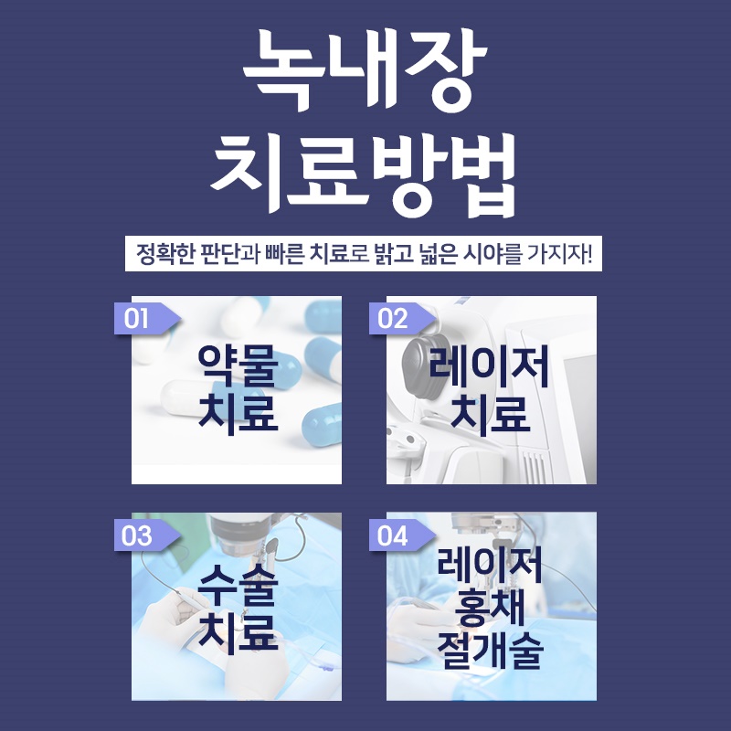 녹내장이 발생하였다고 하더라도 시신경의 손상 정도에 따라 차이가 있기 때문에 증상의 발현 정도나 시기에도 차이가 발생할 수 있습니다.그러나 결과적으로는 시야가 점차 좁아지고, 이후 다양한 시력 장애를 초래하게 됩니다만.일단 망가진 시신경은 회복할 수 없기 때문에 현 시력 상태를 유지할 목적으로 치료를 하는 것이 중요합니다.보통 녹내장 치료는 안압을 낮추는 조치를 취하지만, 안약이나 내복약 등을 사용하여 필요에 따라 레이저나 수술 요법을 실시합니다.레이저치료도 안압을 낮추는 것이 목적이며 약물치료나 레이저치료만으로도 안압이 적절히 떨어지지 않을 경우 수술적인 방법을 시행하고 있습니다.