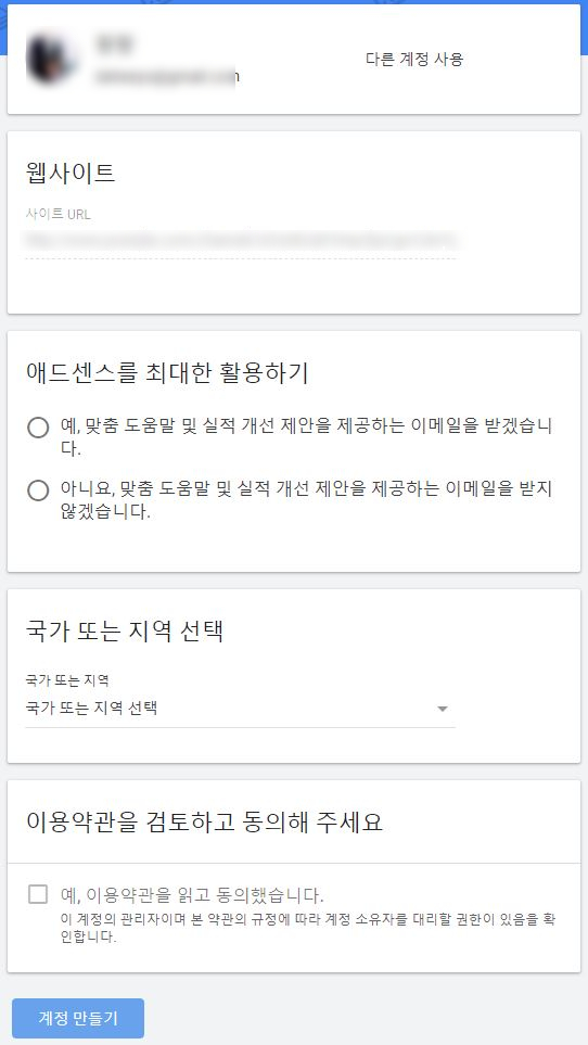 이때 어드센스로 쓰는 계정을 나름 신중하게 골랐습니다 저는 유튜브 계정이랑 같은 계정으로 만들었어요