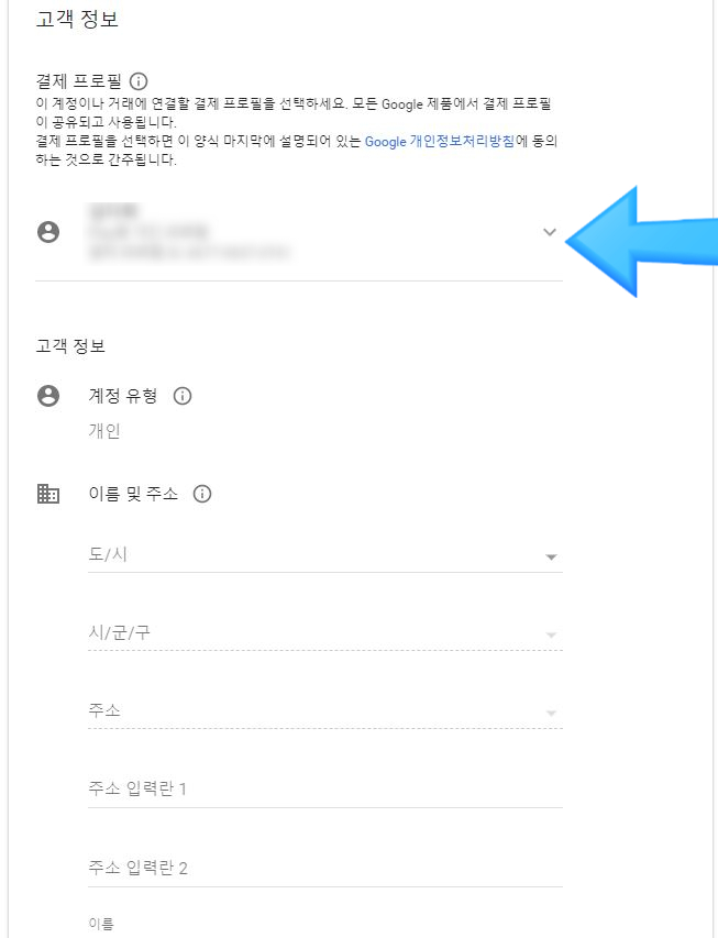 파란색 화살표 부분에 결제 프로필을 넣을 수 있는데.. 저는 Play용 개인 프로필을 설정해 놨습니다.