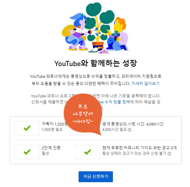 유튜브 수익창출 조건을 충족시켜 수익창출을 신청하였습니다 🙂