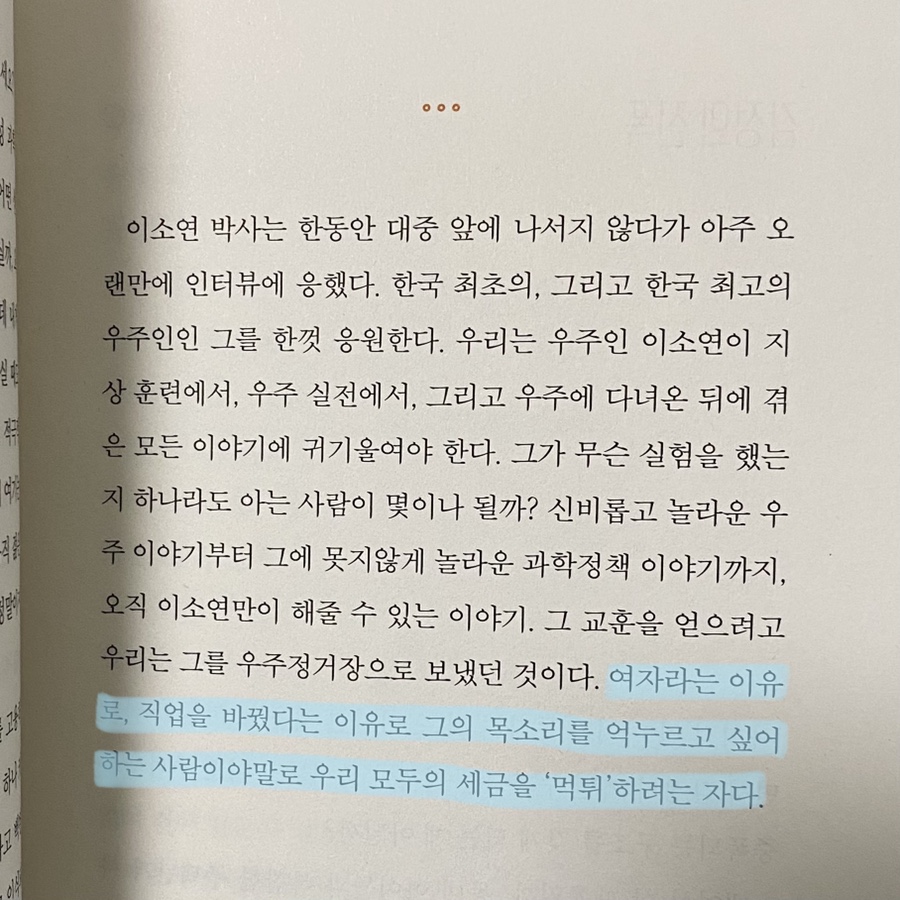유학하지 않고 경희대에서 학석박보닥까지 마치고 연구 중인 심채경 교수. 선배들을 따라가 1-1로 연구실로 들어가 연구를 보조하면서 교수님이 “누구 타이탄 연구해요?”라고 물었더니 “네!”라고 대답하고 타이탄 연구가 시작됐다고… 타이탄을 연구하게 된 것도, 연구실로 들어가 대학원에 가고 싶을 때 탐사선이 타이탄 정보를 보내왔다고 한다. 엄청난 우연이지만 내가 신이었다면 이 사람을 천문학자로 만들어 보이겠다는 맹세하에 우연을 조작했을 것이다. 무려 네이처에서 달 연구 주도의 젊은 과학자 5명 중 한 명으로 심 교수를 소개했다. 나머지 4명이 중국 인도 영국 미국처럼 우주탐사에 열심인 국가의 연구소 출신임을 감안할 때 한국인이 뽑혔다는 것은 정말 대단하다. 자신이 동경하는 우주를 끊임없이 좋아하고 분석하고 연구한다. 자기 분야에서 맡은 일에 최선을 다해 하는 사람은 얼마나 아름다운가. 10여 년 전에는 나로호가 있었고 최근에는 누리호가 있었다. 비록 미완의 성공이지만 나로호도 몇 번의 실패 끝에 성공했다. 다른 나라에 비해 연구 투입 인력도 현저히 적어 한국은 우주탐사에 그리 두각을 나타낸 나라가 아니다. 어려운 환경에서도 연구가 진행되고 발사까지 시도했다는 것 자체가 자랑스럽다. 심 교수를 시작으로 좀 더 많은 사람들이 천문학에 관심을 갖고 연구했으면 한다. 그러면 한국도 머지않아 우주탐사에 ‘진심’의 나라 대열에 합류할 것이다. 이미 올라갔을 수도 있어
