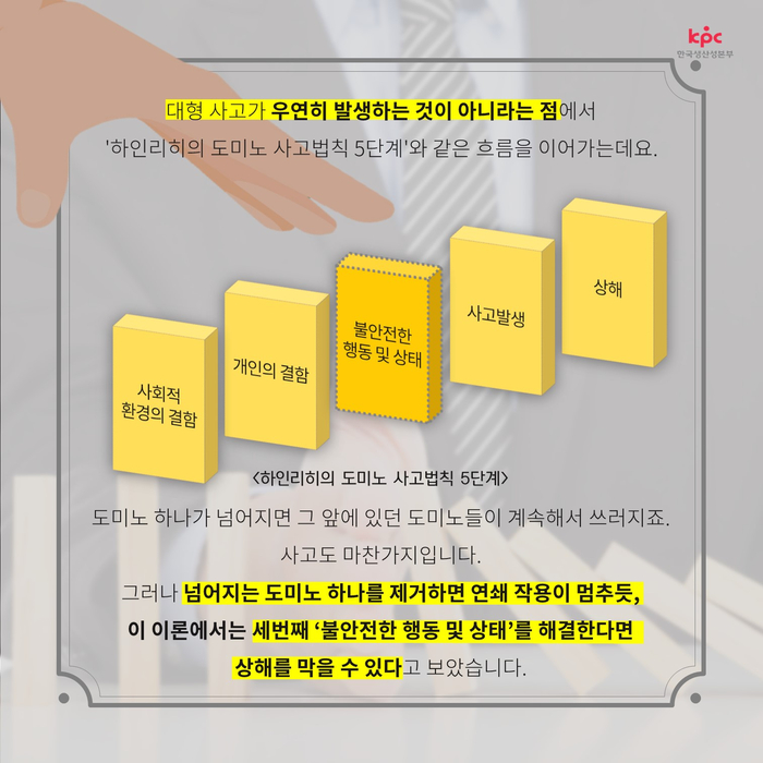 따라서 대형사고가 우연히 발생하는 것이 아니라는 점에서 하인리히 도미노 사고법칙 5단계와 같은 맥을 짚고 있습니다.사회적 환경결함 > 개인결함 > 불안정한 행동, 상태 > 사고발생 > 상해