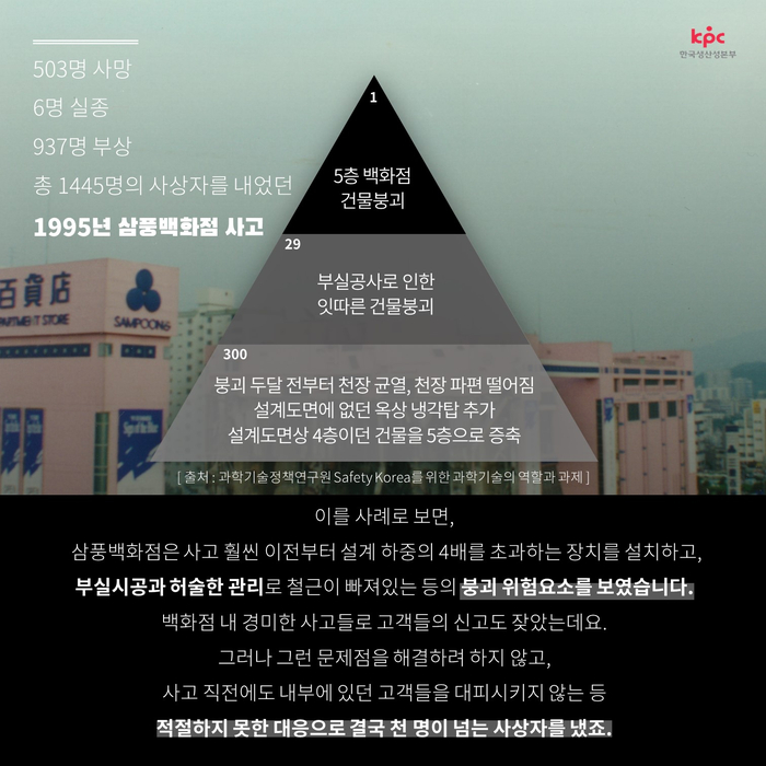 삼풍백화점 붕괴사건을 예로 들어보겠습니다. 삼풍백화점은 사고 이전부터 설계하중의 4배가 넘는 장비를 설치했고, 부실 공사와 관리 소홀로 철근이 빠지는 등 붕괴 위험성이 높은 곳에 있었습니다.