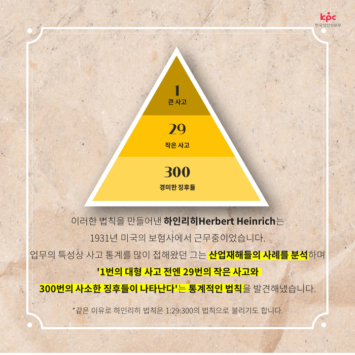“이러한 법칙을 하인리히(herber the inrich)는 1931년 미국 보험회사에 근무했습니다” 업무 특성상 사고 통계를 많이 접해 온 그는 산업 재해 사례를 분석하고 통계적 법칙을 발견했습니다. 그것은 노동 재해가 발생하여 중상자가 1명 나오면 그 전에 같은 원인으로 발생한 경상자가 29명, 같은 원인으로 부상할 뻔한 잠재적 부상자가 300명 있었다는 것입니다. 그래서 하인리히 법칙은 1:29:300 법칙이라고도 하는데요