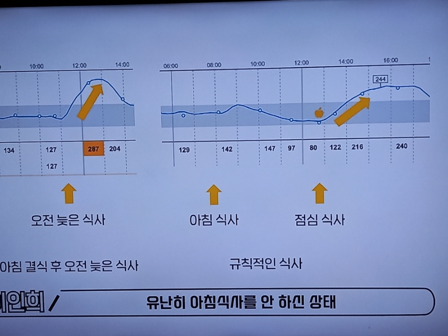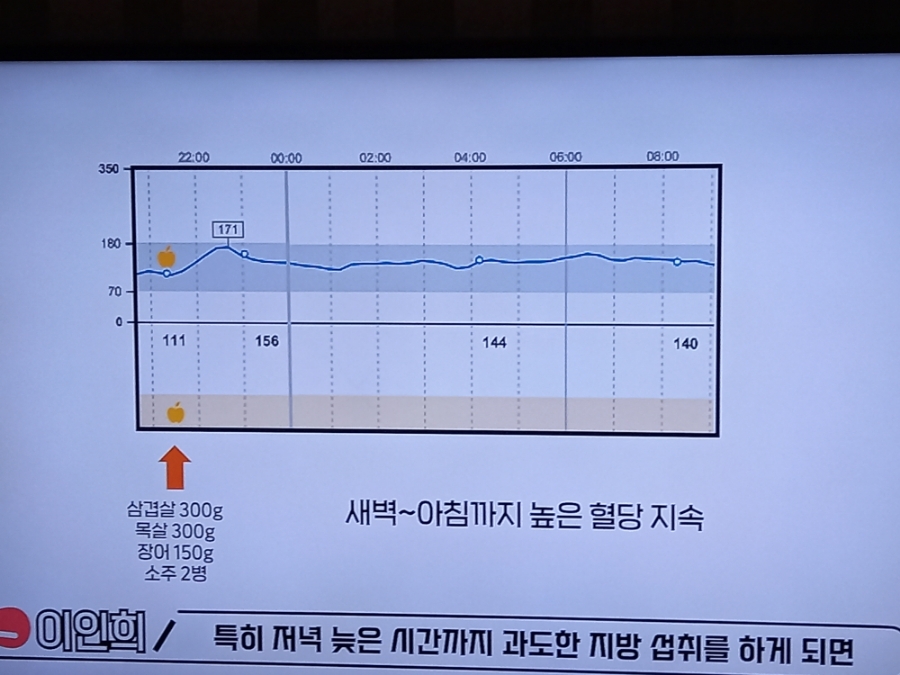 닥터 스누지 – 서울대학교병원 강남센터 이인희 임상영양사가 설명한 내용입니다과량의 탄수화물을 섭취하지 않았는데 장시간 고혈당이 되는 식사 패턴이 있습니다.위의 이미지를 보시면, 늦은 시간에 과잉 지방을 섭취하면, 이른 아침부터 아침에 걸쳐 높은 혈당치가 계속 되어 다음날 아침의 식전 혈당치도 상승한 상태가 됩니다.지방 과다 섭취는 식후 2시간 후의 혈당 상승에 많은 영향을 줍니다.