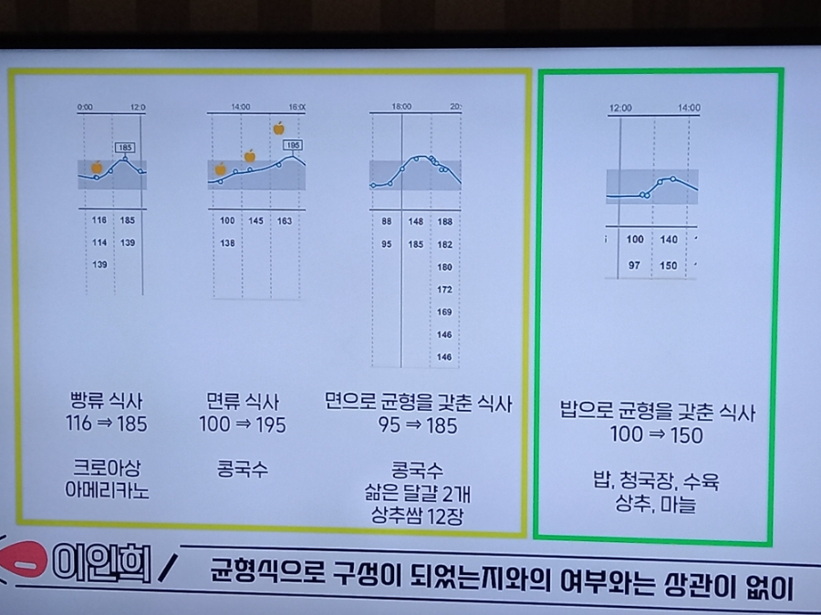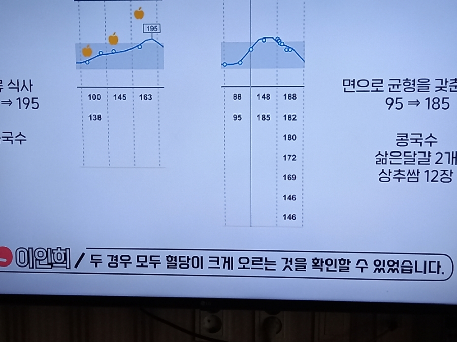 닥터 스누지 – 서울대학교병원 강남센터 이인희 임상영양사가 설명한 내용입니다이분은 면을 드실때 삶은 계란, 상추쌈 등등 영양 밸런스를 잘 잡아서 드셨는데 혈당이 많이 올라가는걸 보실수 있습니다.