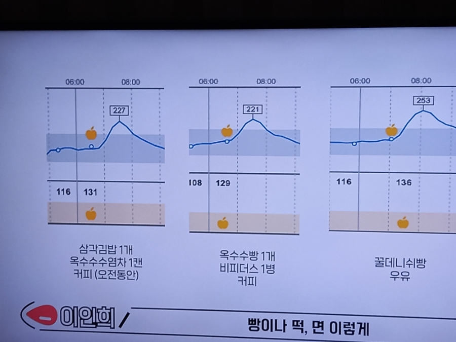 닥터 스누지 – 서울대학교병원 강남센터 이인희 임상영양사가 설명한 내용입니다위 그림을 보면 주먹밥, 옥수수빵, 꿀 데니쉬빵, 우유 등 당질 위주의 식사를 했을 때도 혈당이 많이 올라갑니다.