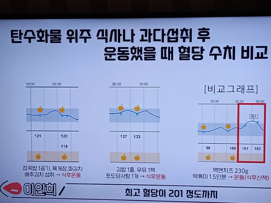 닥터 스누지 – 서울대학교병원 강남센터 이인희 임상영양사가 설명한 내용입니다탄수화물을 섭취하고 나서 운동을 하면 혈당이 잘 오르는 것을 볼 수 있습니다.