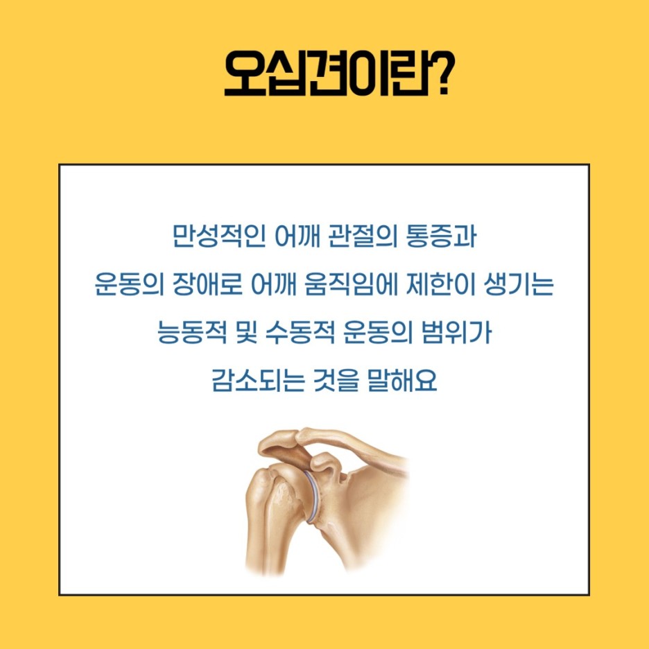 오십견이라는 질환은 오십대 전후로 발생한다고 하여 붙여진 이름이며 과도한 통증과 함께 운동범위 제한을 유발하는 질환입니다.