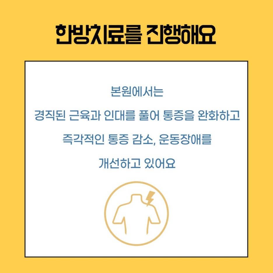 현재 상태가 중증이 아니면 한의학적으로 치료가 가능하며, 본원에서는 발병 원인, 통증의 범위, 강도에 맞게 맞춤 치료를 진행하고 있습니다.