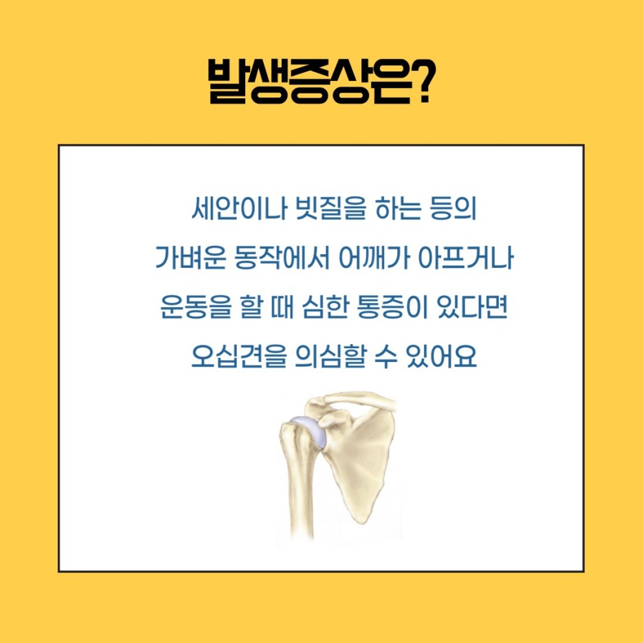 통증 발생, 보통 오십견은 서서히 발생하므로 초기에는 팔 근육통으로 의심할 정도로 통증이 강하지 않을 수 있습니다.