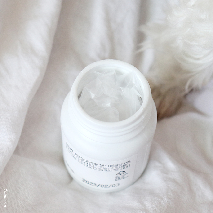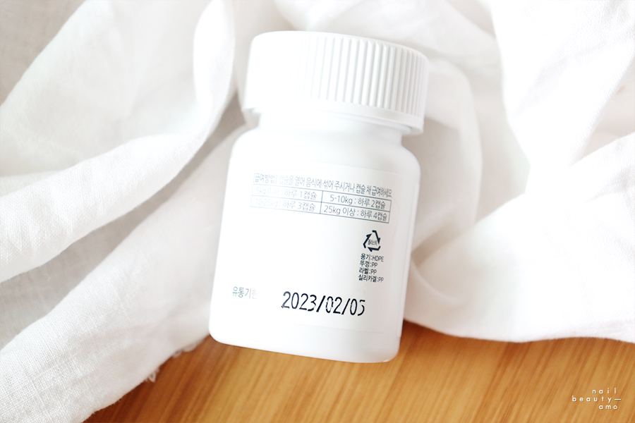 용기 안에는 총 60정이 들어 있습니다5kg 미만 기준으로 하루에 1캡슐, 5kg~10kg는 하루에 2캡슐입니다10~25kg는 하루 3캡슐, 25kg 이상은 하루 4캡슐이므로 캡슐을 개봉하여 음식이나 물에 섞어주거나 캡슐을 꺼내서 주거나 합니다.