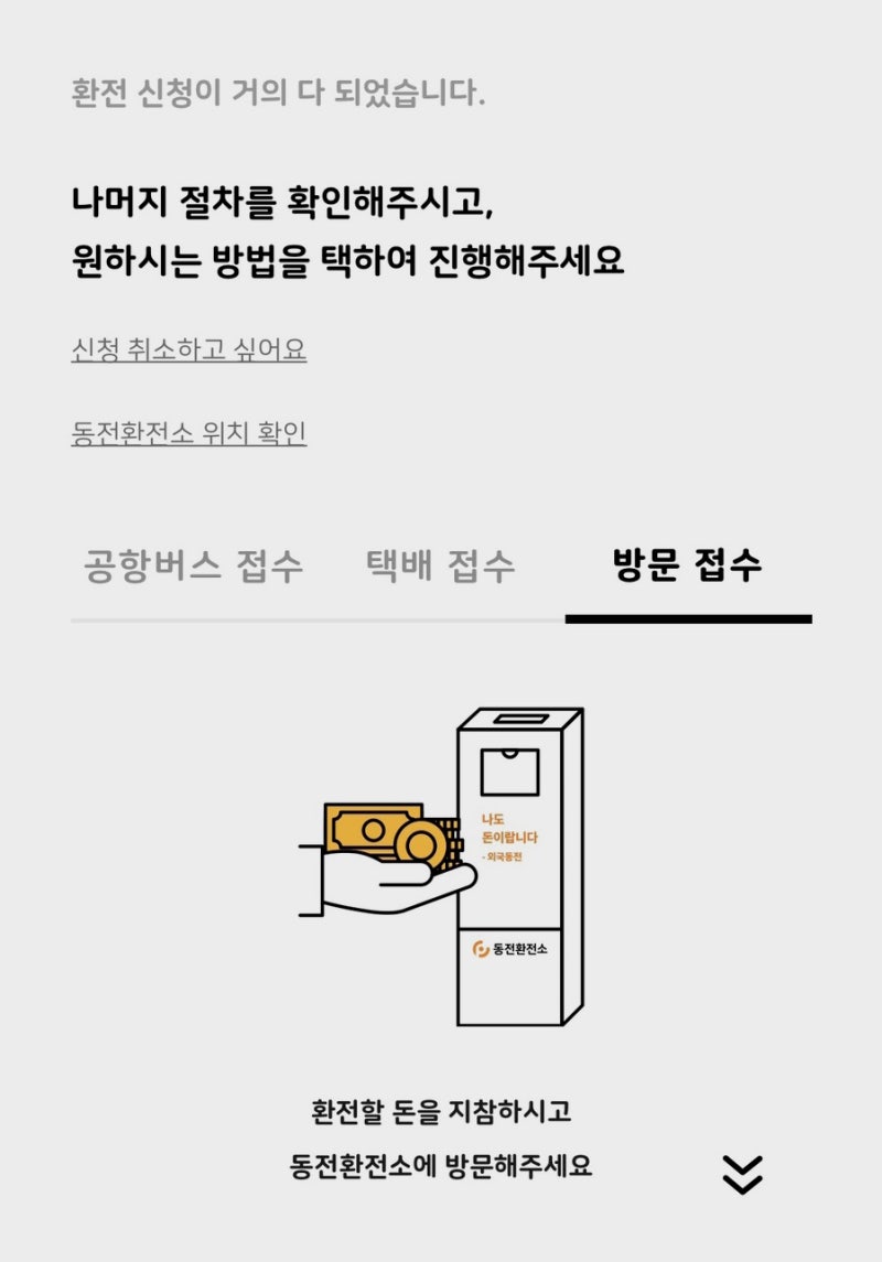 나라를 선택해서이처럼 해당 코인을 선택하면 매입이 가능한 코인의 사진이 명확히 나와 있어 혼란스럽지 않았다. 각 코인별로 환전 예상 금액이 표기돼 있는데, 이는 수수료까지 제외한 예상 금액으로 실제 환율보다는 조금 적다고 봐야 한다. 하지만 은행에서는 취급하지도 않는 소액 동전까지 모두 구입해 주니 그만큼 수수료는 감내해야 할 것 같다.내가 환전하고자 하는 코인을 모두 리스트업 완료했다면 아래와 같이 세 가지 방법 중 하나를 선택하면 된다. 나는 방문접수 선택!한 줌 이상 있었던 것 같은데 ㅋㅋ 엄청 작은 단위의 코인이라 그런지 7600원 정도 예상 금액이 책정됐다. 이는 예상 금액으로 회수가 완료됐으며 매입 당시 환율을 고려해 최종 금액이 설정될 예정이다. 오프라인 회수포인트로 가서 방문접수코인 환전소 회수 포인트는 서울 14곳에 있는데 자세한 목록은 해당 홈페이지를 참고하세요.체인지포인트 16개국 동전과 지폐를 계좌로 입금합니다 changepoint.kr나는 집에서 가까운 아래 장소를 이용하기로 했어.워시라움대치점 서울특별시 강남구 삼성로63길 48-4324시간 세탁소 안에 위치하다니 정말 똑똑한 것 같아.워시라움 대치점은 24시간 셀프 세탁방이다.들어가자마자 한쪽 구석에 이런 작은 통이 보인다.동전교환소라고 크게 써있어서 못찾는건 없어.수거함 옆에는 이런 봉투가 있었는데 봉투마다 고유 QR코드가 적혀 있다. 가져간 돈 여기에 다 넣고 앱에 QR코드 등록해서 수거함에 넣으면 끝!이렇게 잘 밀봉해서 넣어준다. 환전 완료단계별로 알람이 모두 와서 어떻게 처리되는지 알려준다. 최종적으로 입금까지는 딱 일주일 걸렸어.그 사이 환율이 오르면서 7622원이던 신청금액은 8435원으로 조금 늘었다.작지만 소중한 8435원을 받아서 기뻐. 집에 잠든 작은 동전이 있으면 시도해 보세요.:)